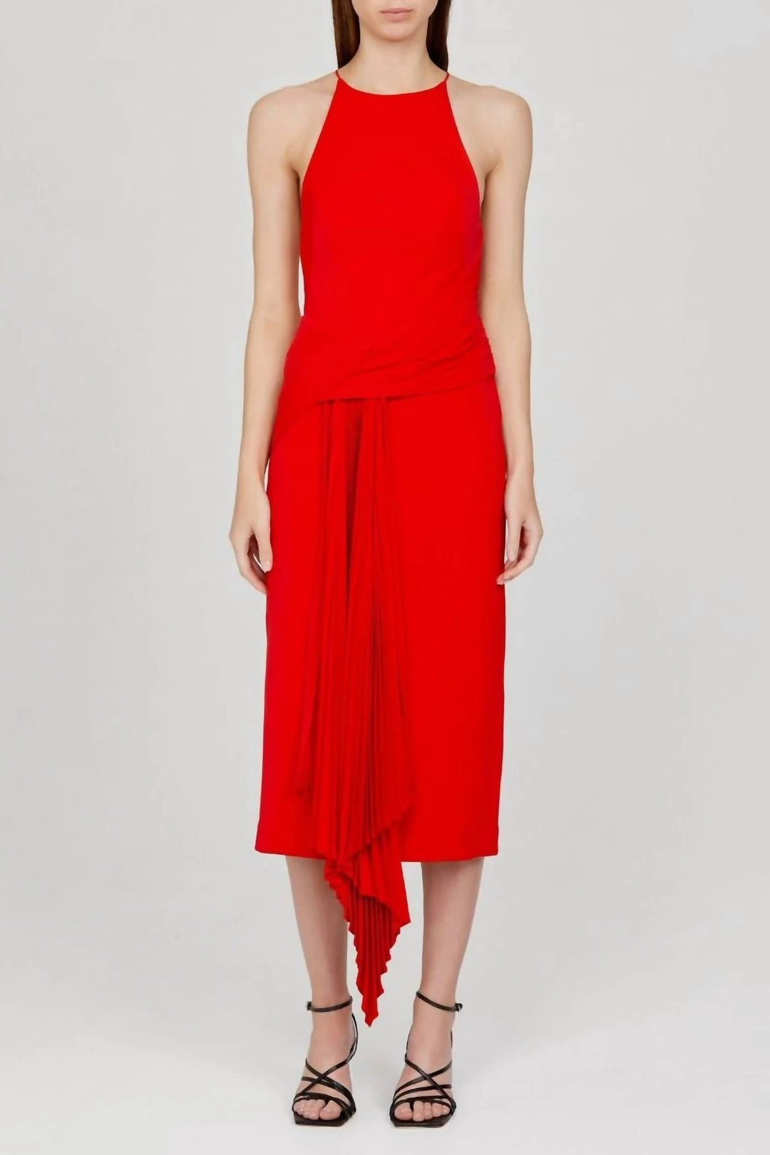 With soft draping detail, the Bercy styles are sophisticated pieces that can be worn from desk to dinner. – Midi dress- High neckline with rouleaux straps- Pleated waist tie with asymmetrical drape- Invisible side zip- Fully-lined