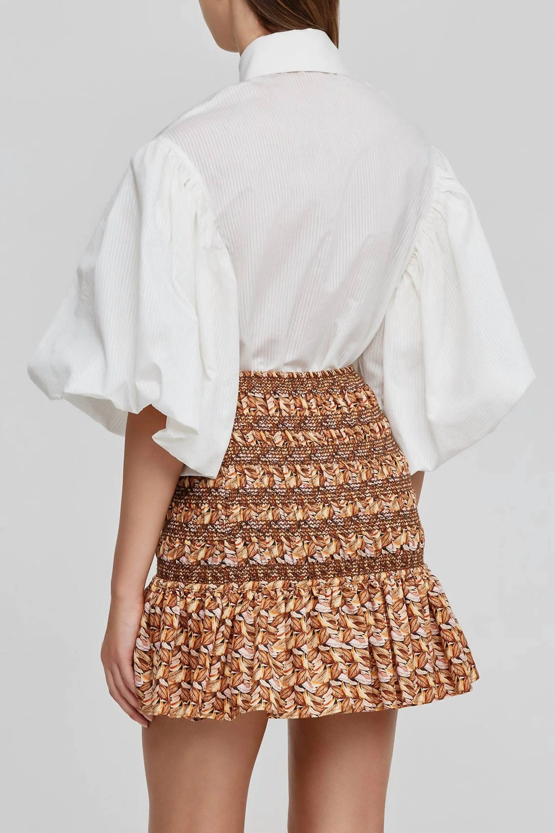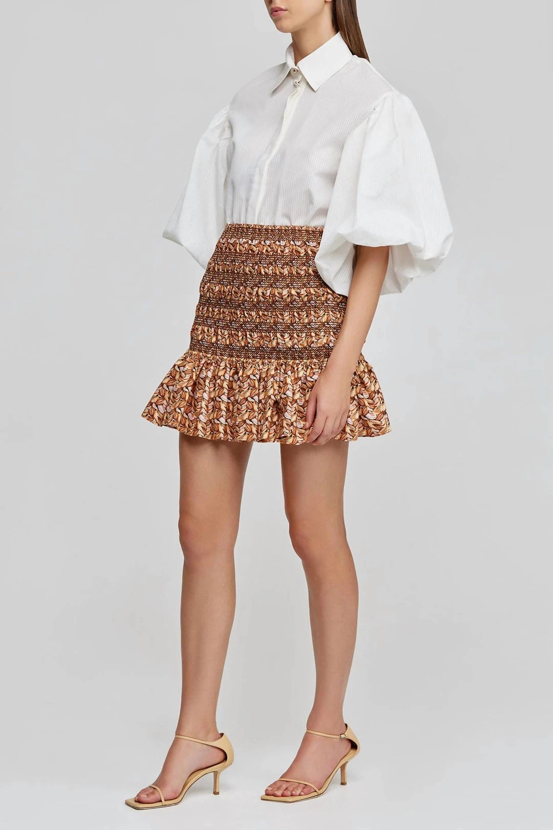The Kyle Skirt in Neutral Leaves is designed to be fitted. Details – – Mini skirt- Shirred panel- Elastic waistband- Frill toward the hem- Half linedModel wears size 8AU / 4US