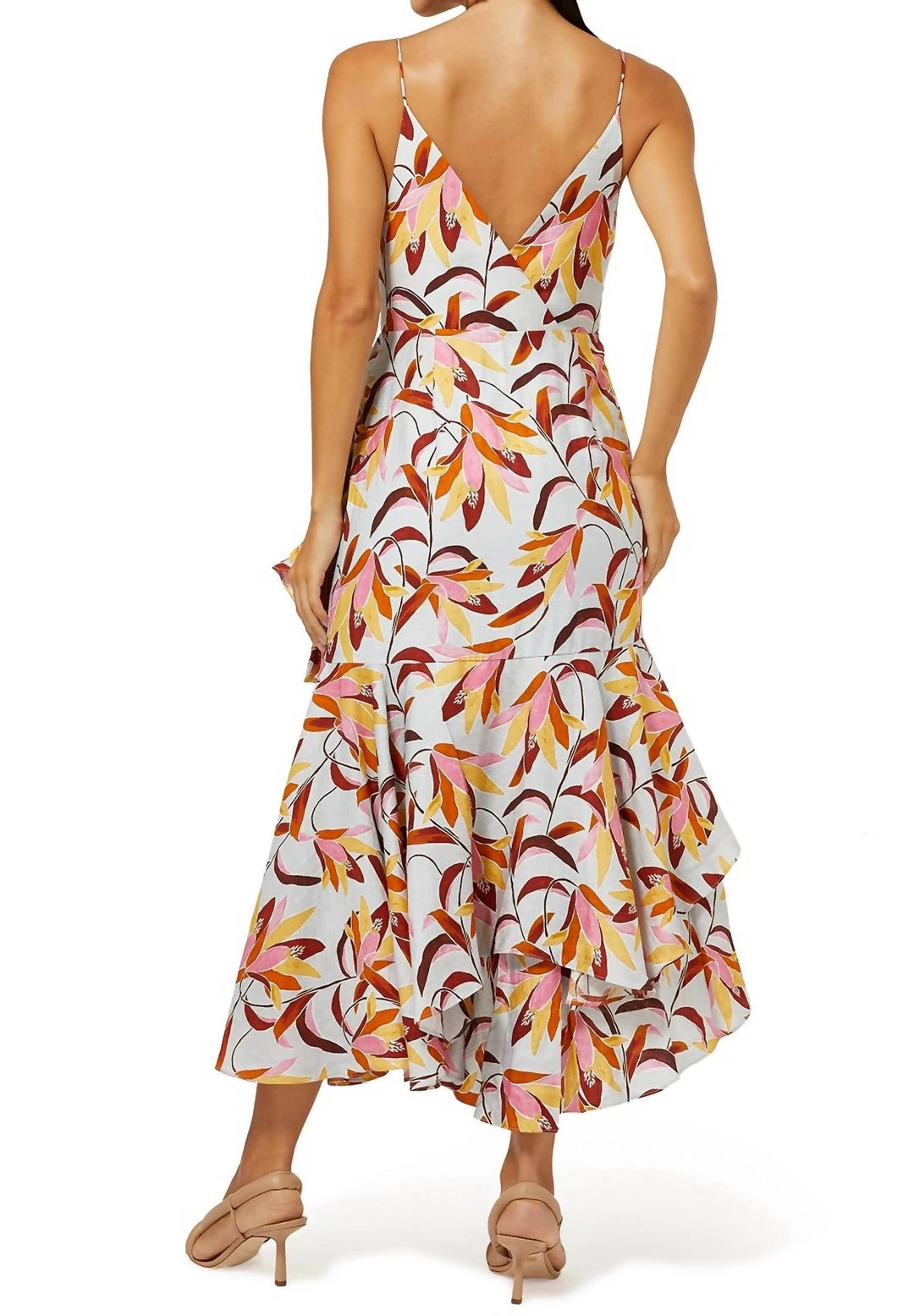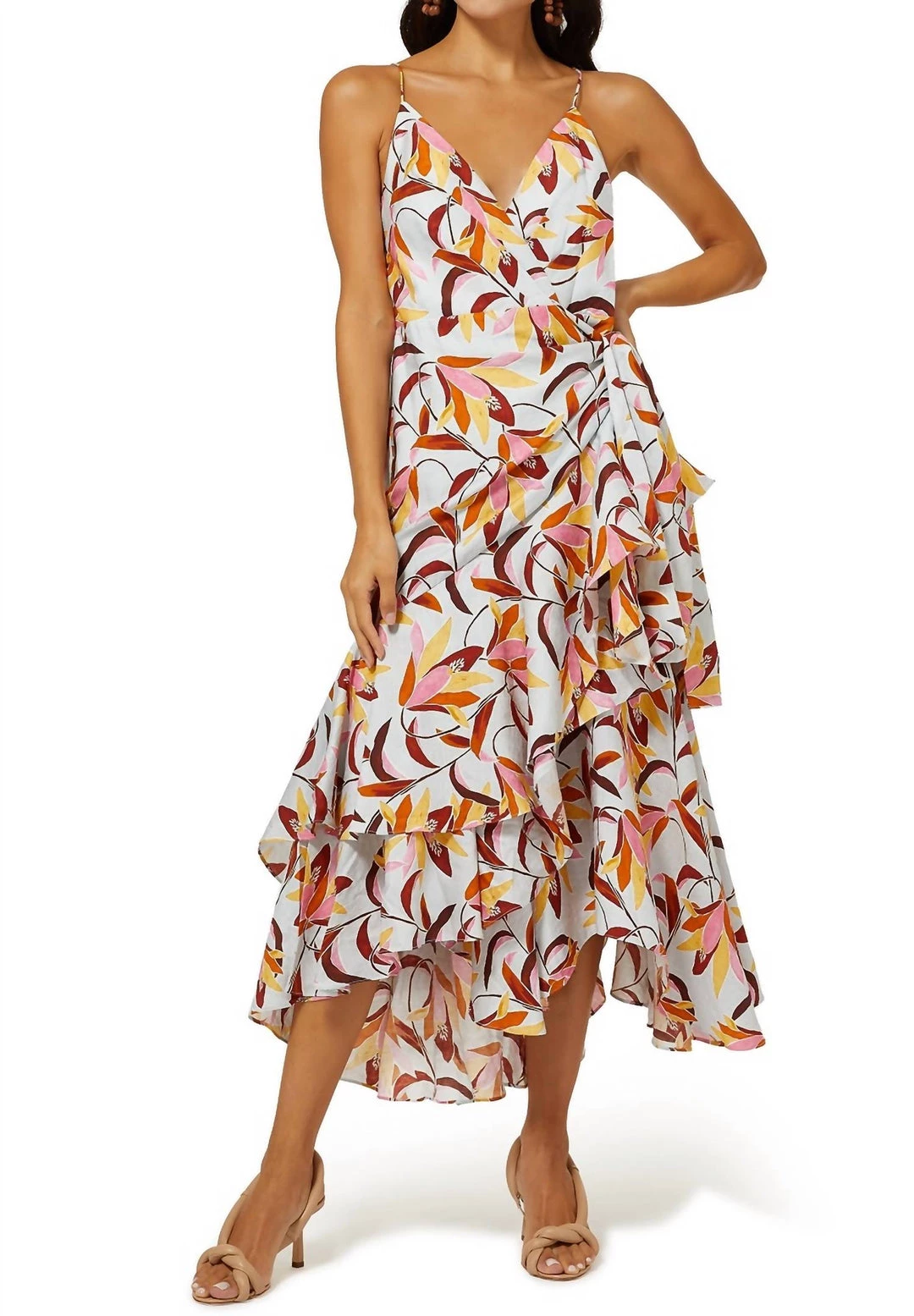Product Details- Midi dress- Fitted waist with twist detail- Spaghetti straps- V-neckline- Exclusive Acler print- Tiered ruffle wrap look skirtModel MeasurementsModel wears size 8AU/ 4US – Model height is 180cm